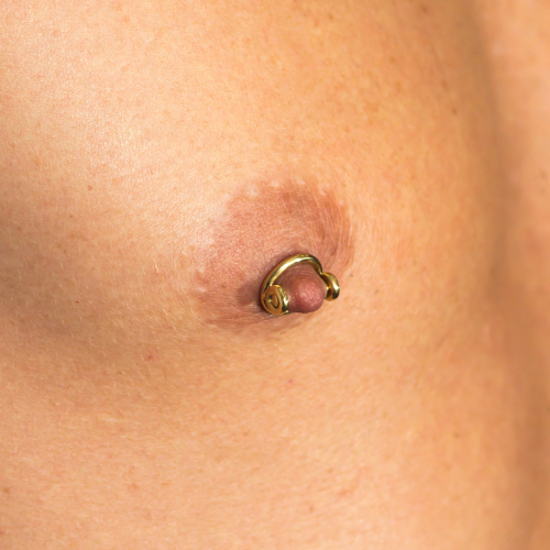 "A golden ring around the nipple with a screw-on bar, designed to gently push out the nipple. No barbell is required for this design.