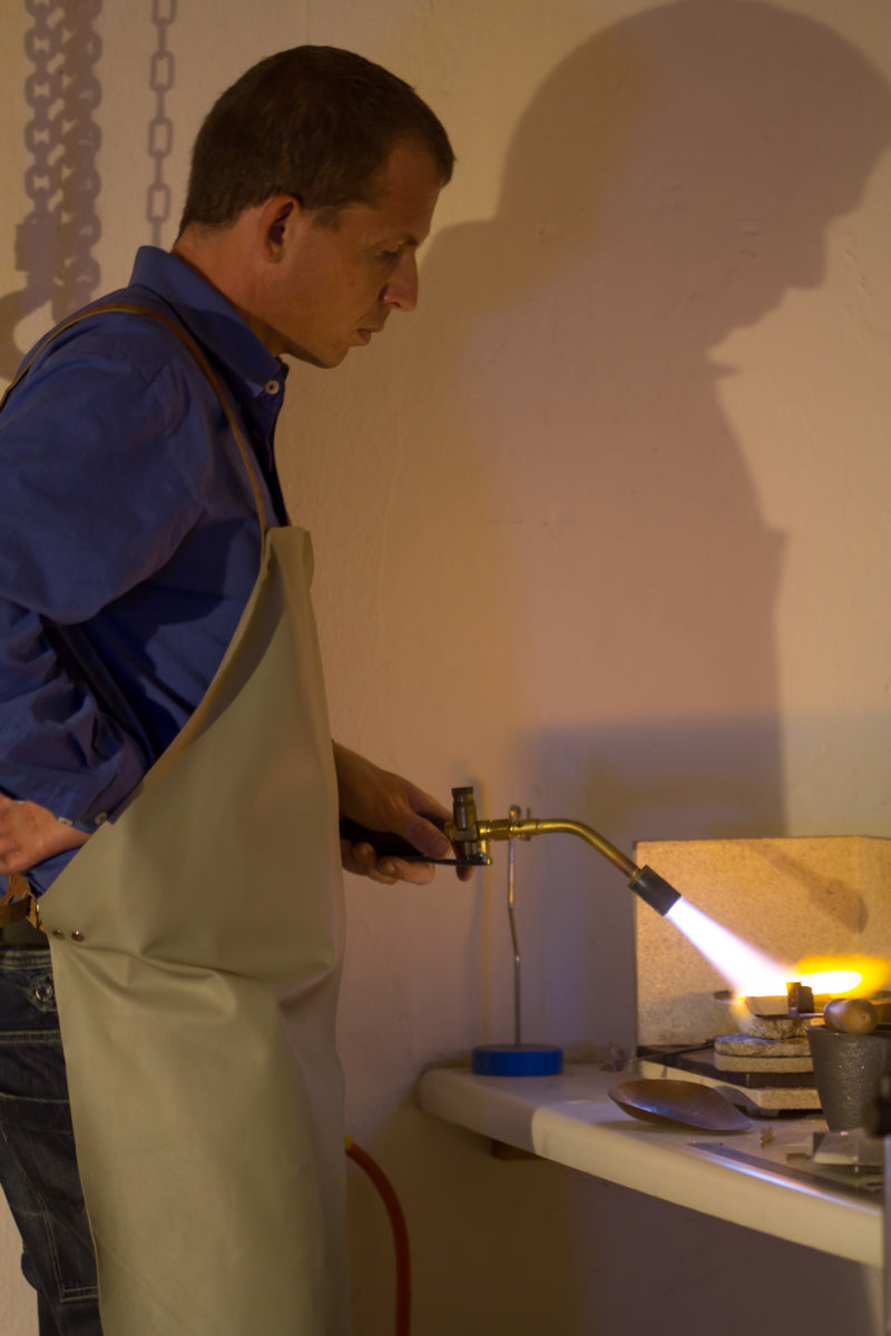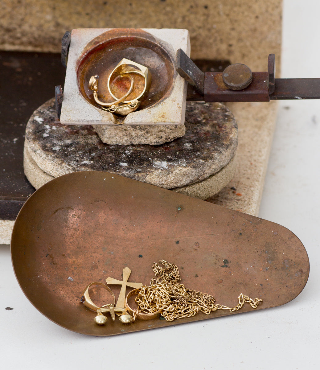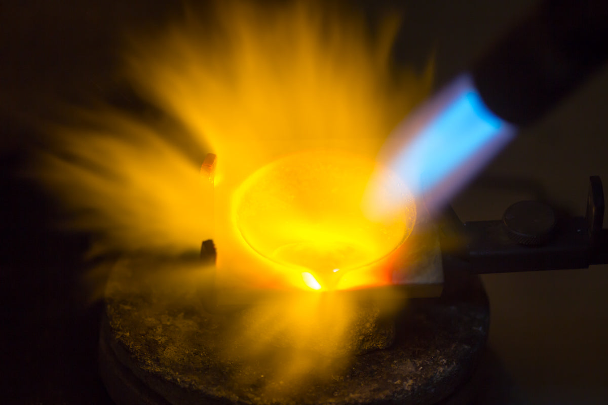 Wir schmelzen in unserer Werkstatt das benötigte Metall in einem Schmelztiegel mit Hilfe einer Schmelzpistole. Die Schmelzpistole wird mit Propangas betrieben um auf Temperaturen von ca. 1100 ° C zu kommen, die man z. b. benötigt, um Feingold zu schmelzen.